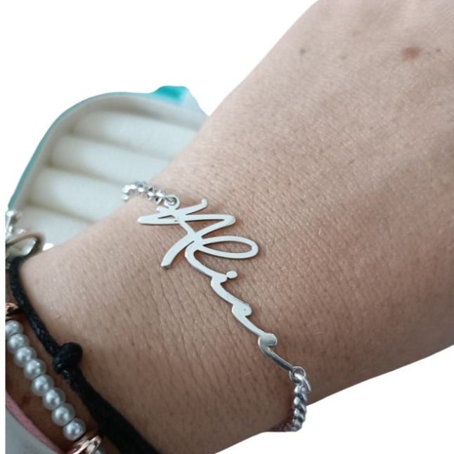 Bracciale nome personalizzato con font in corsivo stilizzato; realizzabile anche con bagno colore oro giallo oppure oro rosa (non scoloriscono). Tempi di realizzazione 7/9 giorni lavorativi. Misura regolabile grazie alla catenina di allungamento.
